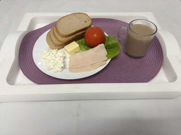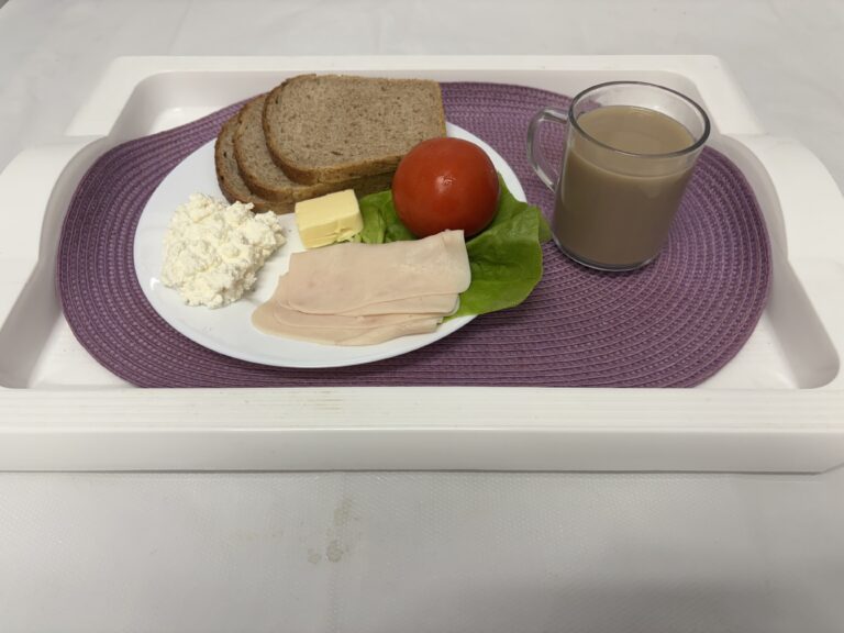 Chleb mieszany pszenno-żytni 125 g (GLU PSZ, GLU ŻYT) Masło 83% tł. 20 g (MLE,) Pasta z twarogu z natką pietruszki 50g (MLE,) Sałata zielona 20 g Kawa zbożowa z mlekiem z/c 250ml (MLE, GLU ŻYT, GLU JĘCZ) Polędwica premium- wędlina dr. średnio rozd. 30 g (SOJ,) Pomidor 80 g