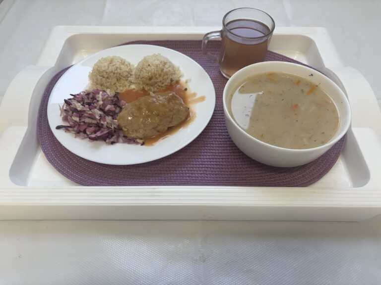 Barszcz biały z ziemniakami 400ml (GLU PSZ, MLE, SEL, GLU ŻYT) Ryż na sypko (brązowy) 200 g Klopsik wieprzowy 80 g (GLU PSZ, JAJ,) Sos pomidorowy 100 ml (GLU PSZ,) Surówka wykwintna z olejem b/c 150 g Kompot owocowy z jabłkami* b/c 250 ml
