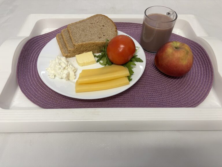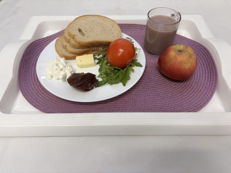 Chleb mieszany pszenno-żytni 100 g (GLU PSZ, GLU ŻYT) Ciasto drożdżowe 40 g (GLU PSZ, JAJ, MLE, S02) Masło 83% tł. 20 g (MLE,) Dżem (truskawowy) 50 g Jabłko 1 szt Kakao z mlekiem z/c 250 ml (MLE,) Serek homo. naturalny 50 g (MLE,) Rukola 10 g Pomidor 90 g