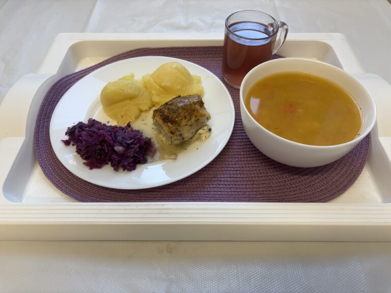 Dyniowa z makaronem 400 ml (GLU PSZ, MLE, SEL) Ziemniaki gotowane 200 g Ryba pieczona (Morszczuk) 120g (RYB,) Sos pietruszkowy 100 ml (GLU PSZ, MLE, SEL) Sałatka z kapusty czerwonej z olejem b/c 150 g Kompot owocowy z jabłkami* b/c 250 ml