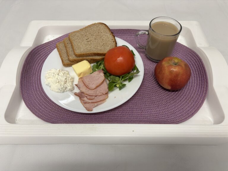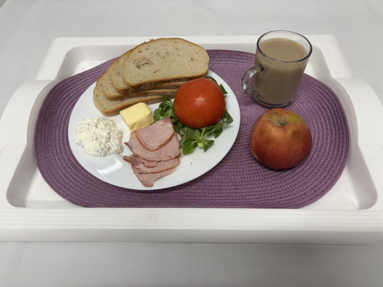 Chleb mieszany pszenno-żytni 125 g (GLU PSZ, GLU ŻYT) Masło 83% tł. 20 g (MLE,) Pasta z twarogu z koperkiem 50g (MLE,) Roszponka 10 g Kawa zbożowa z mlekiem z/c 250 ml (MLE, GLU ŻYT, GLU JĘCZ,) Schab Kruchy z Liszek- wieprzowy, parzony, wędzony 30 g (SOJ, może zawierać: GLU PSZ, MLE, SEL, GOR, S02) Pomidor 90 g Jabłko 150 g