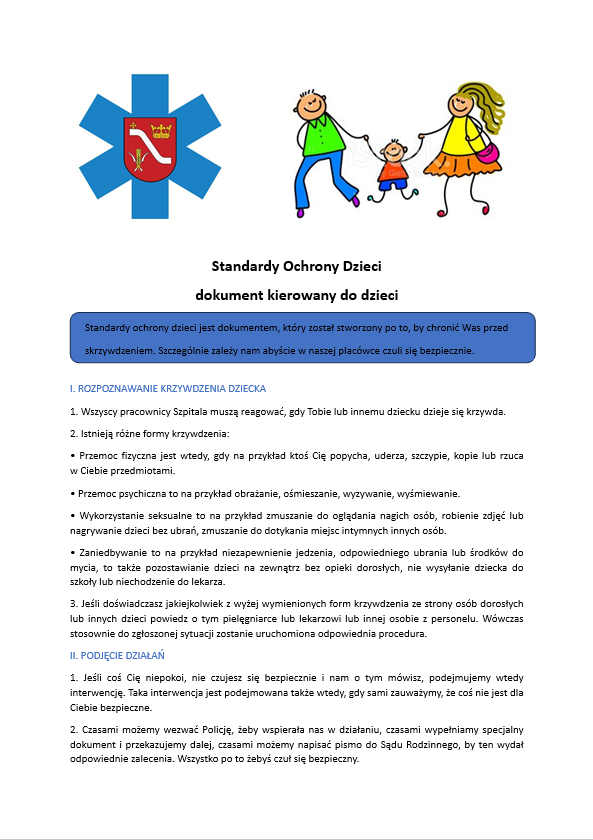 w celu ochrony dziecka. Pracownicy SPZOZ w Proszowicach informują rodziców/opiekunów o Standardach Ochrony Małoletnich oraz współpracują z nimi w celu zapewnienia bezpiecznego środowiska dla dzieci. Dokument udostępniony jest zarówno na stronie internetowej, jak i w widocznym miejscu w placówce (tablice informacyjne).