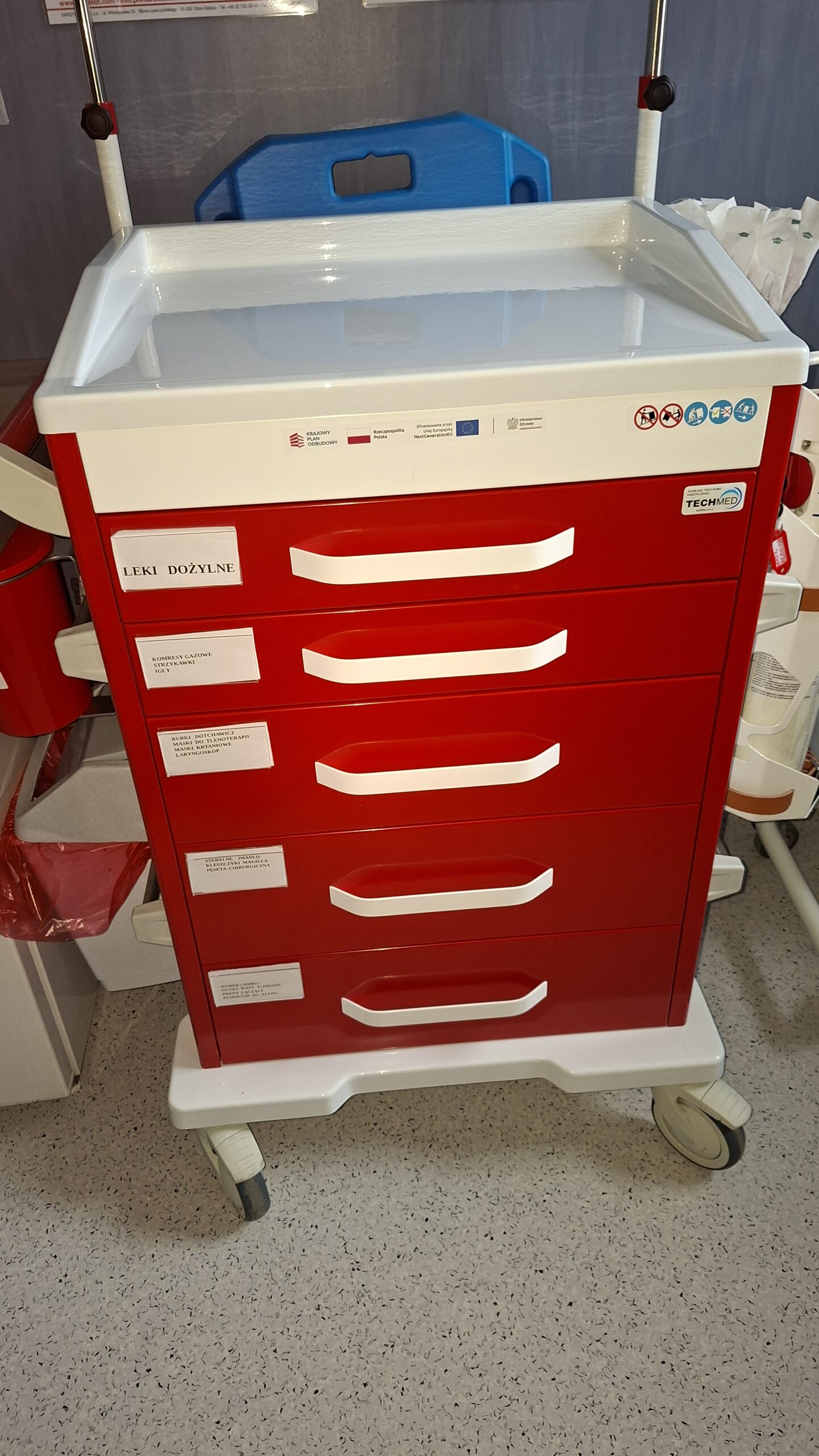 Kompletny zestaw do stałego nadzoru nad pacjentami w stanie ciężkim. Monitory przekazują do centrali pełny obraz parametrów życiowych, co umożliwia obserwację wielu pacjentów z jednego stanowiska. Rozwiązanie to znacząco usprawnia pracę personelu i pozwala na szybkie reagowanie na wszelkie niepokojące zmiany, kluczowe w opiece nad pacjentami onkologicznymi i intensywnie leczonymi. - 3 szt. wózków reanimacyjnych dla Oddziału Anestezjologii i Intensywnej Terapii, Oddziału Ortopedii i Traumatologii Narządu Ruchu, Oddziału Chirurgii OgólnejWózek reanimacyjny wyposażony w niezbędny sprzęt i leki umożliwia natychmiastową reakcję w stanach zagrożenia życia, zapewniając personelowi szybki dostęp do defibrylatora, tlenu i innych środków ratujących życie przy pacjencie. Jego mobilność i kompleksowe wyposażenie usprawniają organizację pracy zespołu oraz zwiększają szanse skutecznej reanimacji w każdym miejscu oddziału.